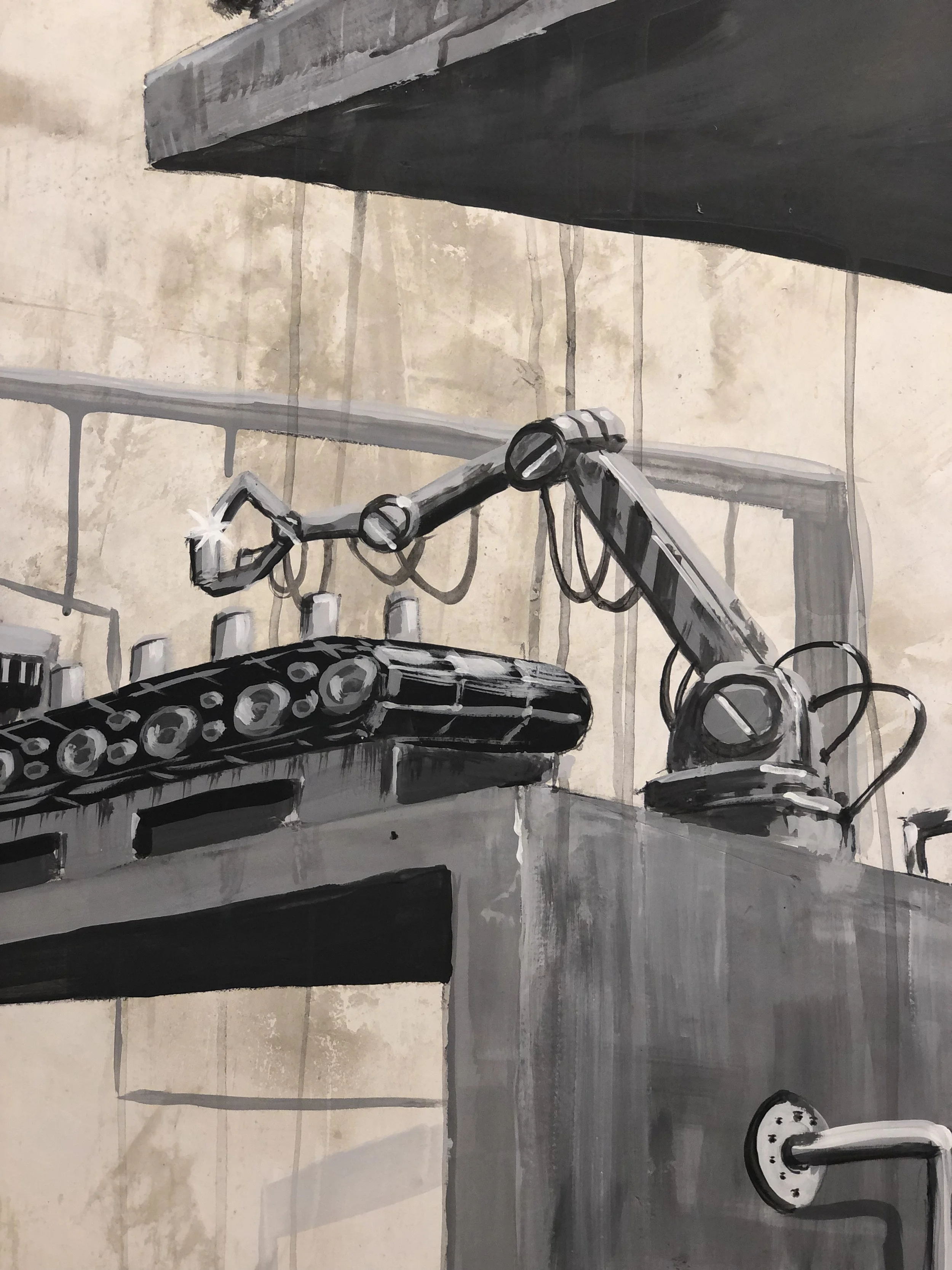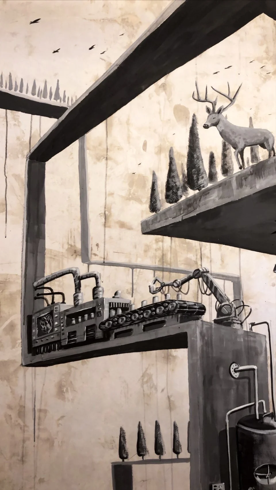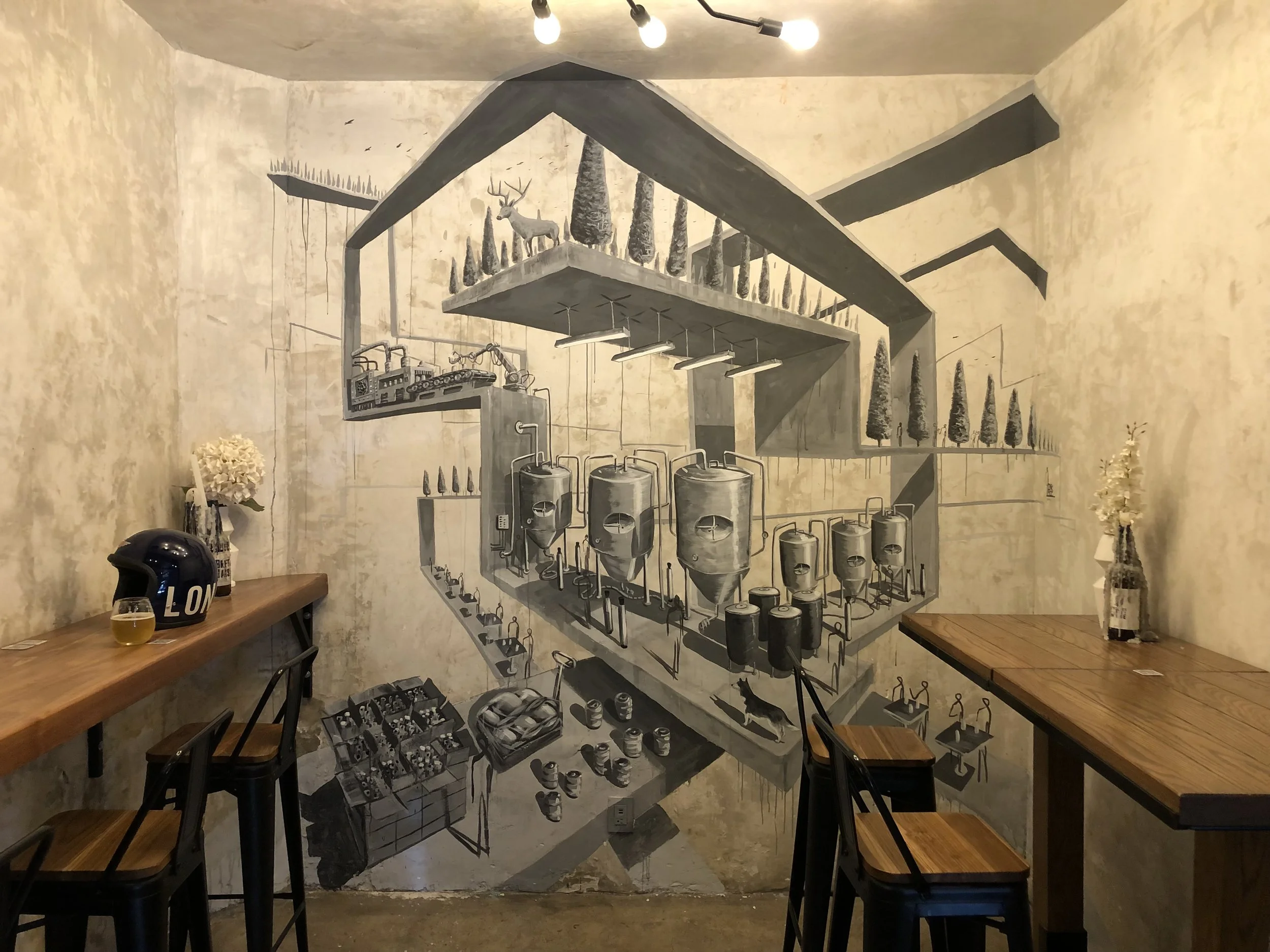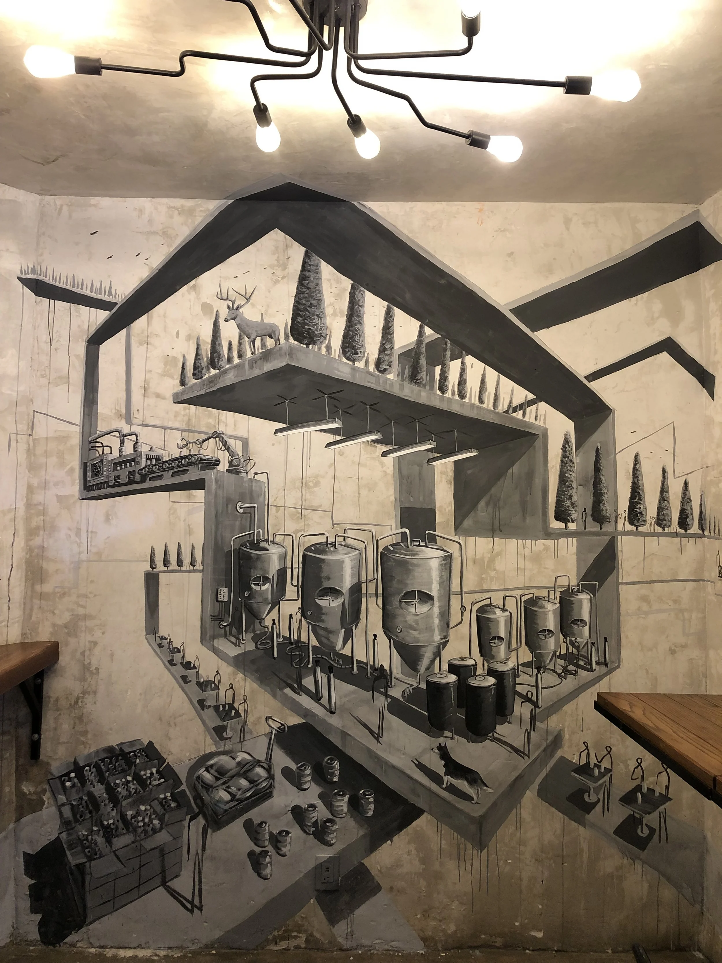 An acrylic mural using forced perspective to expand the visual space of Cyprez Taproom, showing the beer-making process and incorporating key elements of the brand.
