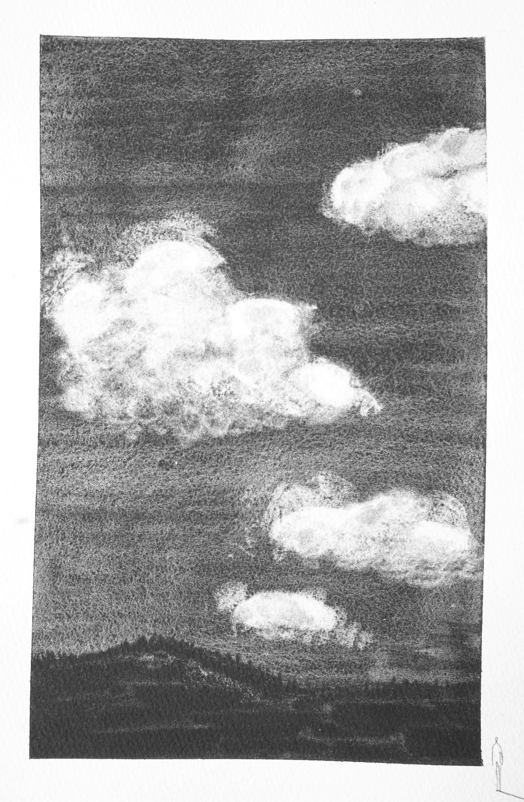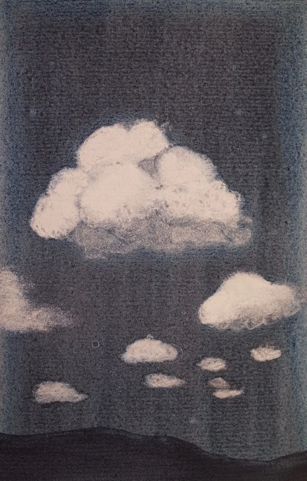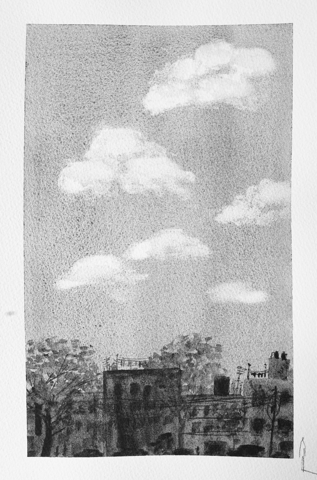 I used watercolour to develop a series of paintings showing the play of sunlight on fast-moving clouds, in a grainy effect inspired by film photography.