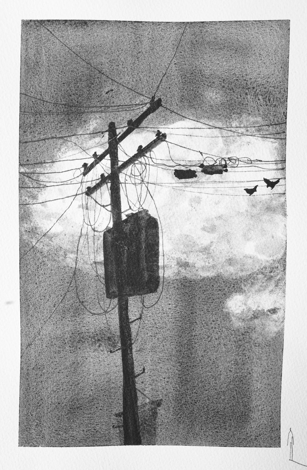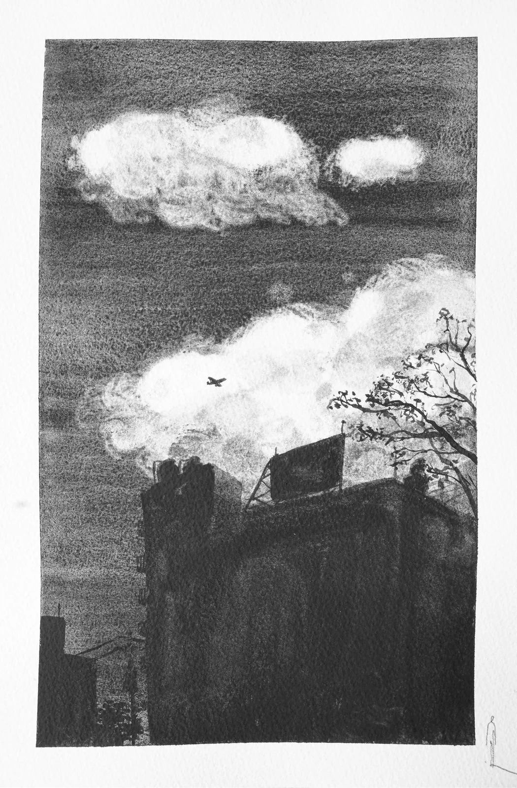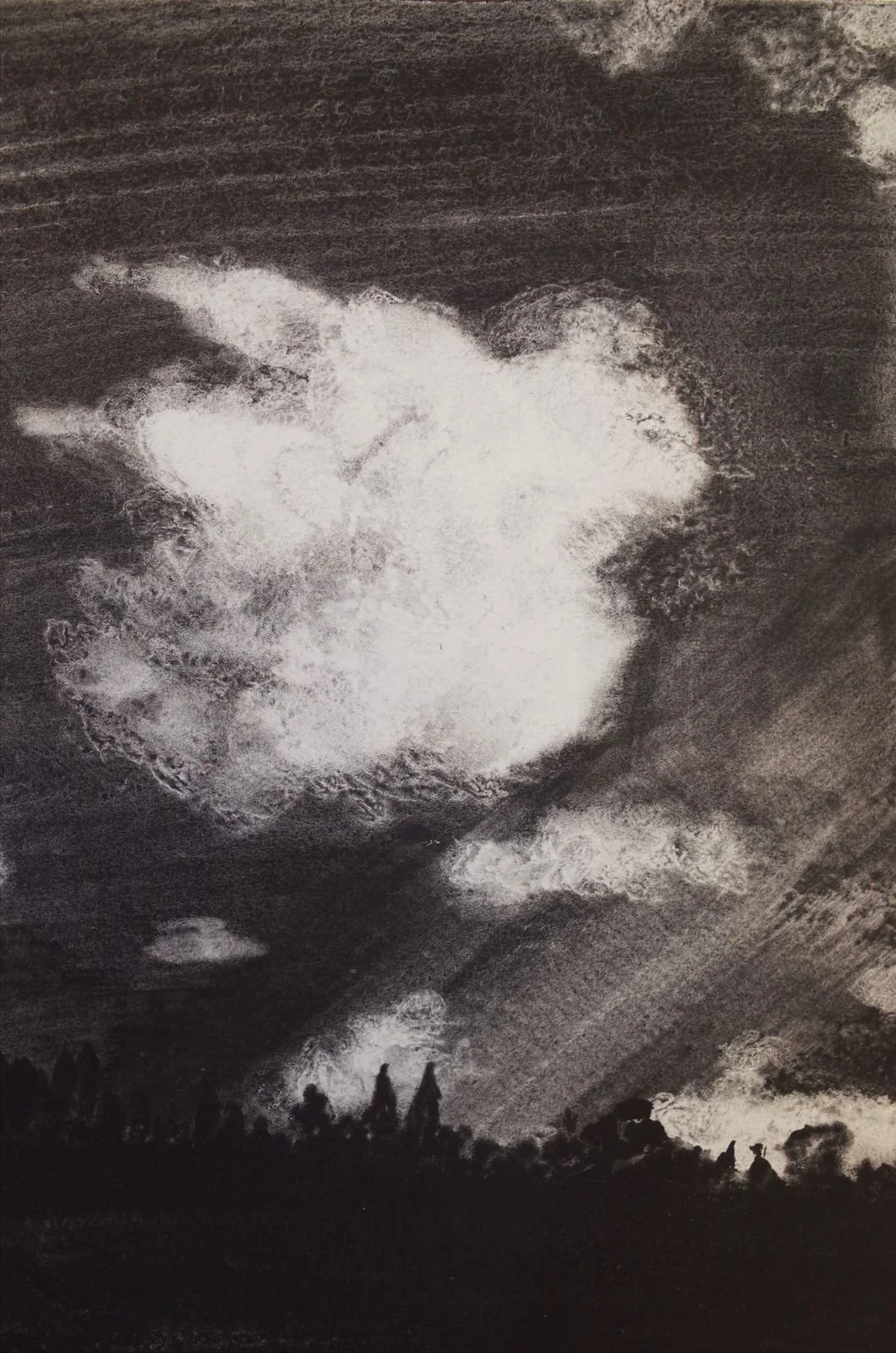I used watercolour to develop a series of paintings showing the play of sunlight on fast-moving clouds, in a grainy effect inspired by film photography.